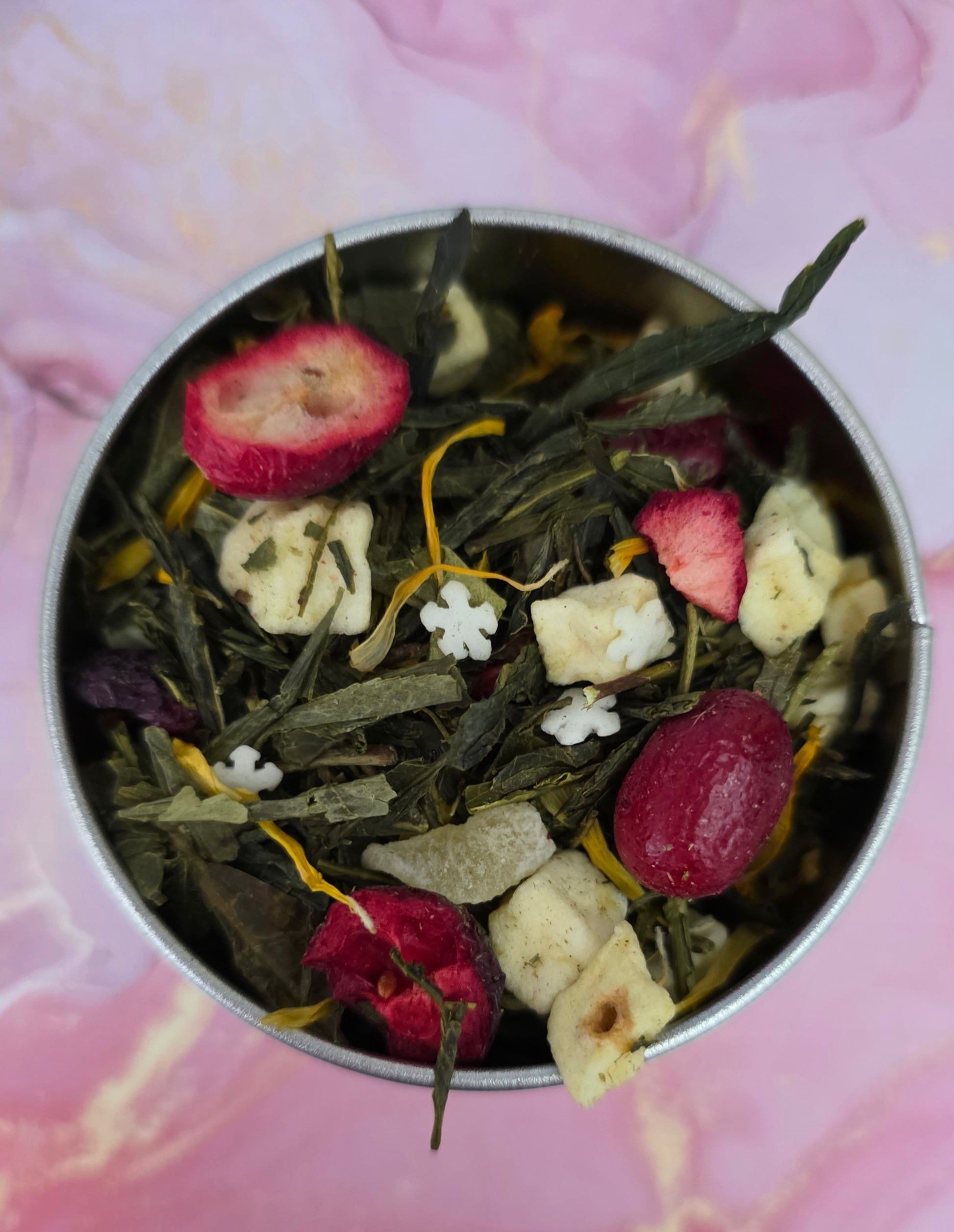 Žalioji senča, cukrinės snaigės, ananasai, obuolių gabaliukai, cukruotos apelsinų žievelės, spanguolių griežinėliai, čiobreliai, medetkų žiedlapiai, kvapiosios medžiagos.